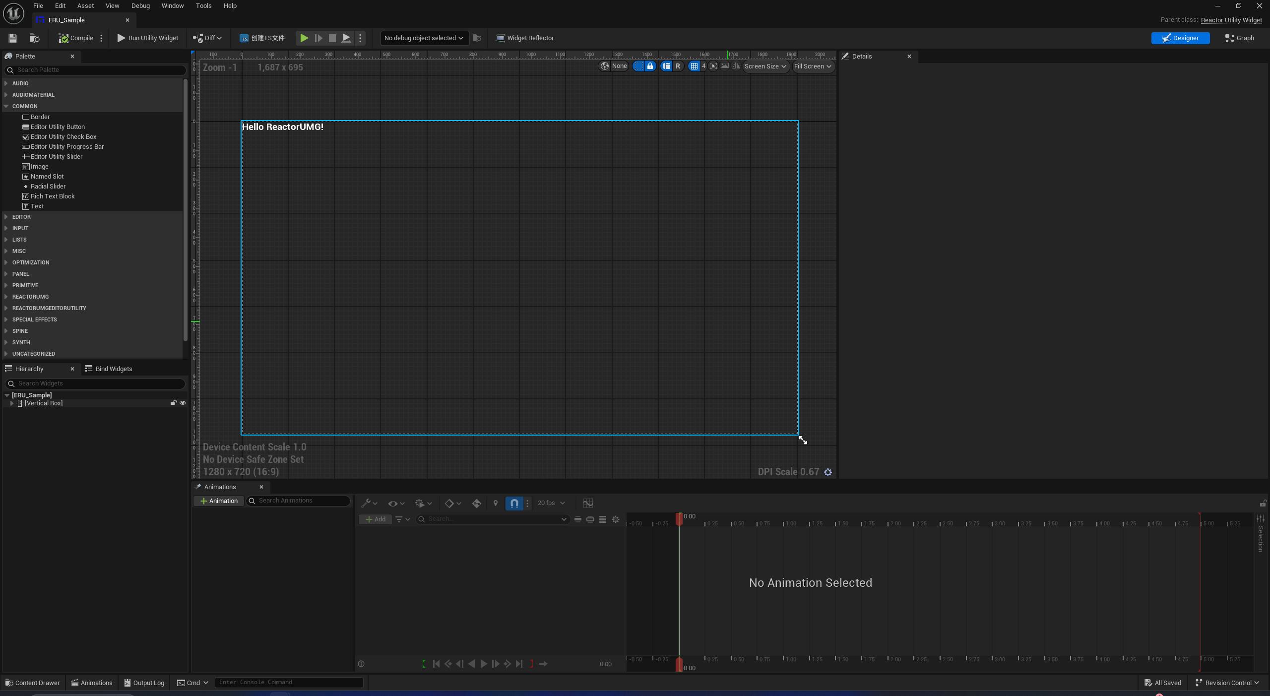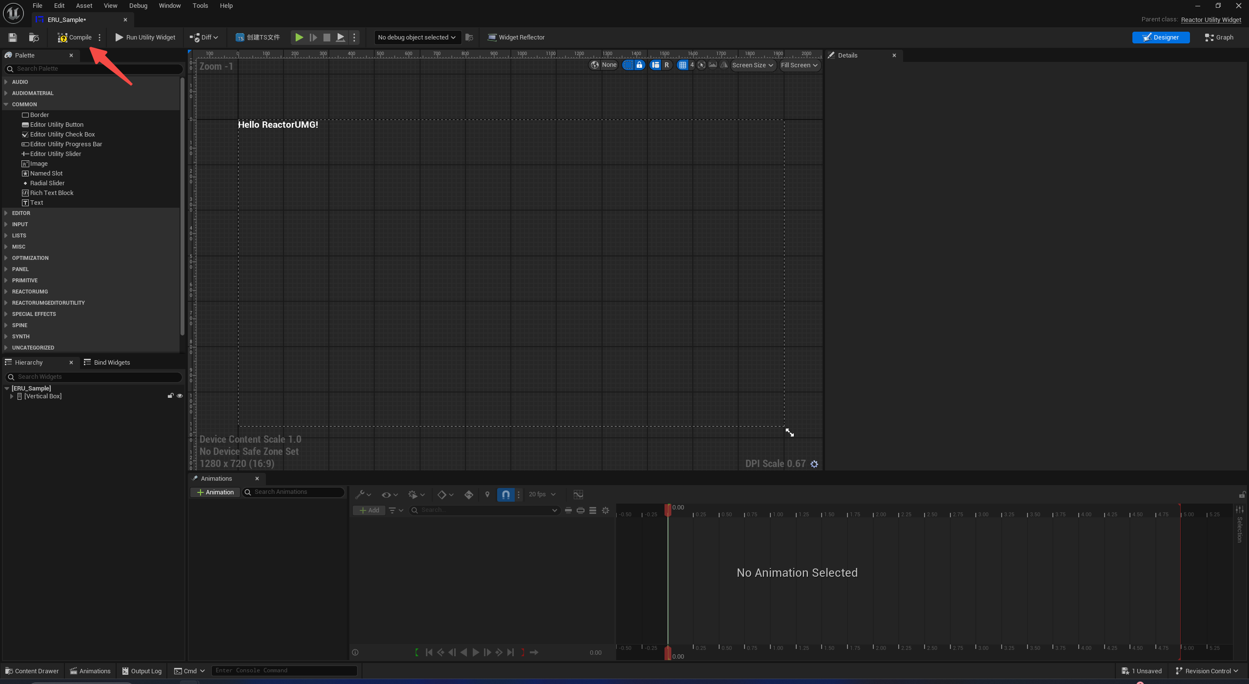 将资产重命名为ERU_Sample,双击打开编辑器,首次打开会执行编译TS的操作,打开后我们能看到默认界面。