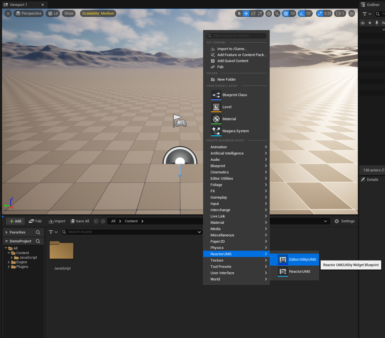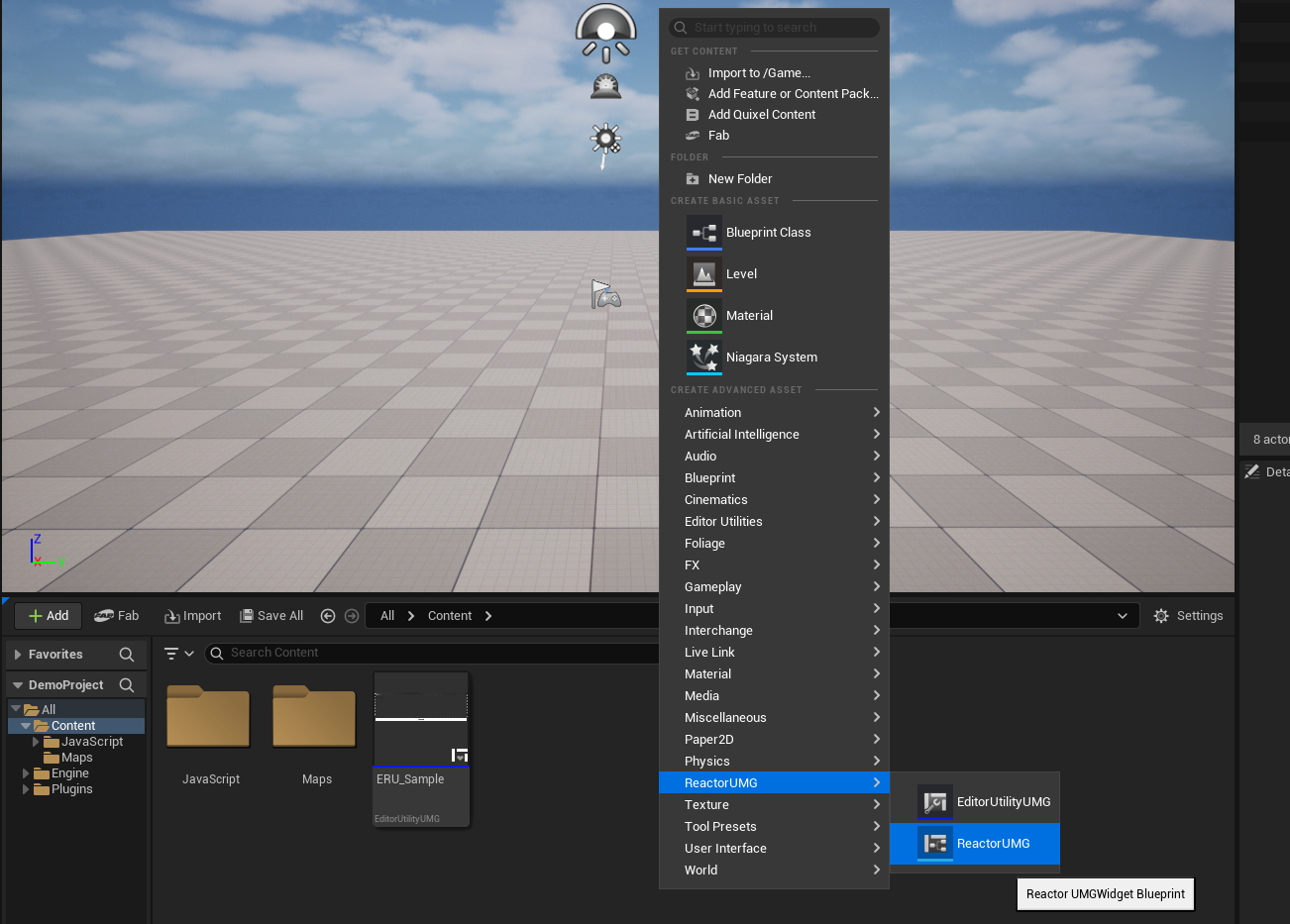 启动编辑器后,在内容浏览器的空白处点击右键弹出资产创建菜单,选中ReactorUMG->EditorUtilityUMG。