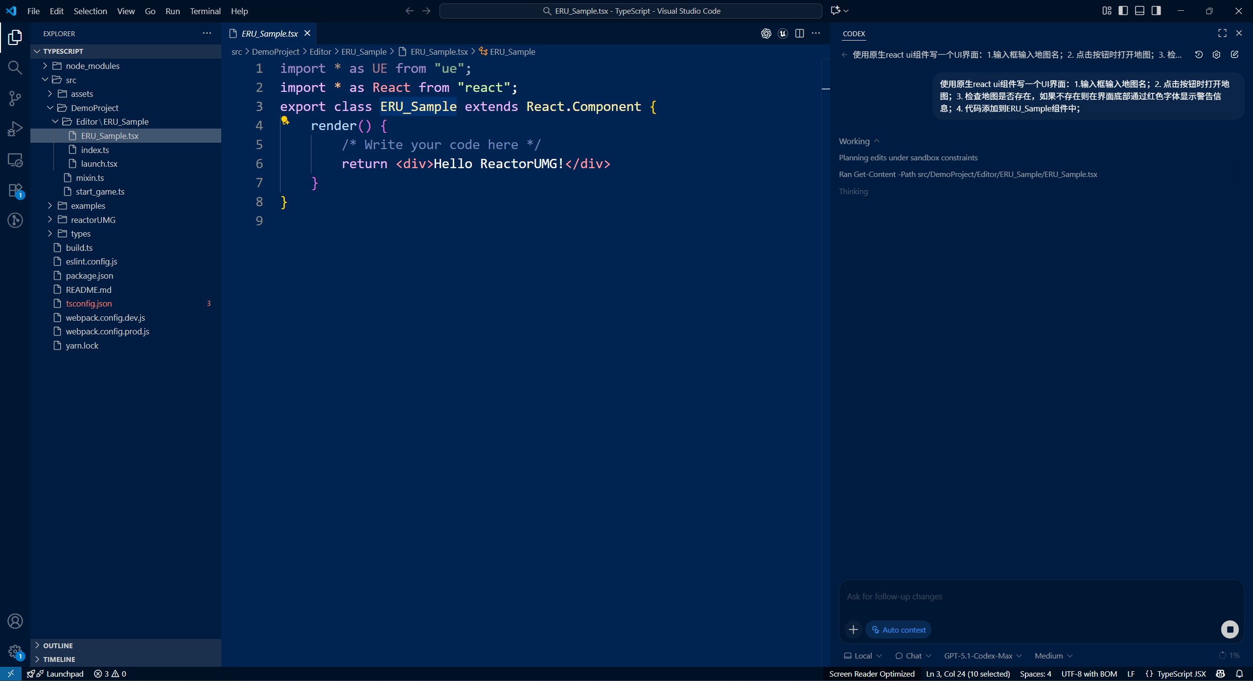 使用任意代码编辑器(VS Code/Cursor/WindSurf/Antigravity)打开ProjectDir/TypeScript目录,并找到ERU_Sample对应的tsx脚本文件,位于ProjectDir/TypeScript/src/Editor/ERU_Sample/ERU_Sample.tsx,如下图所示: