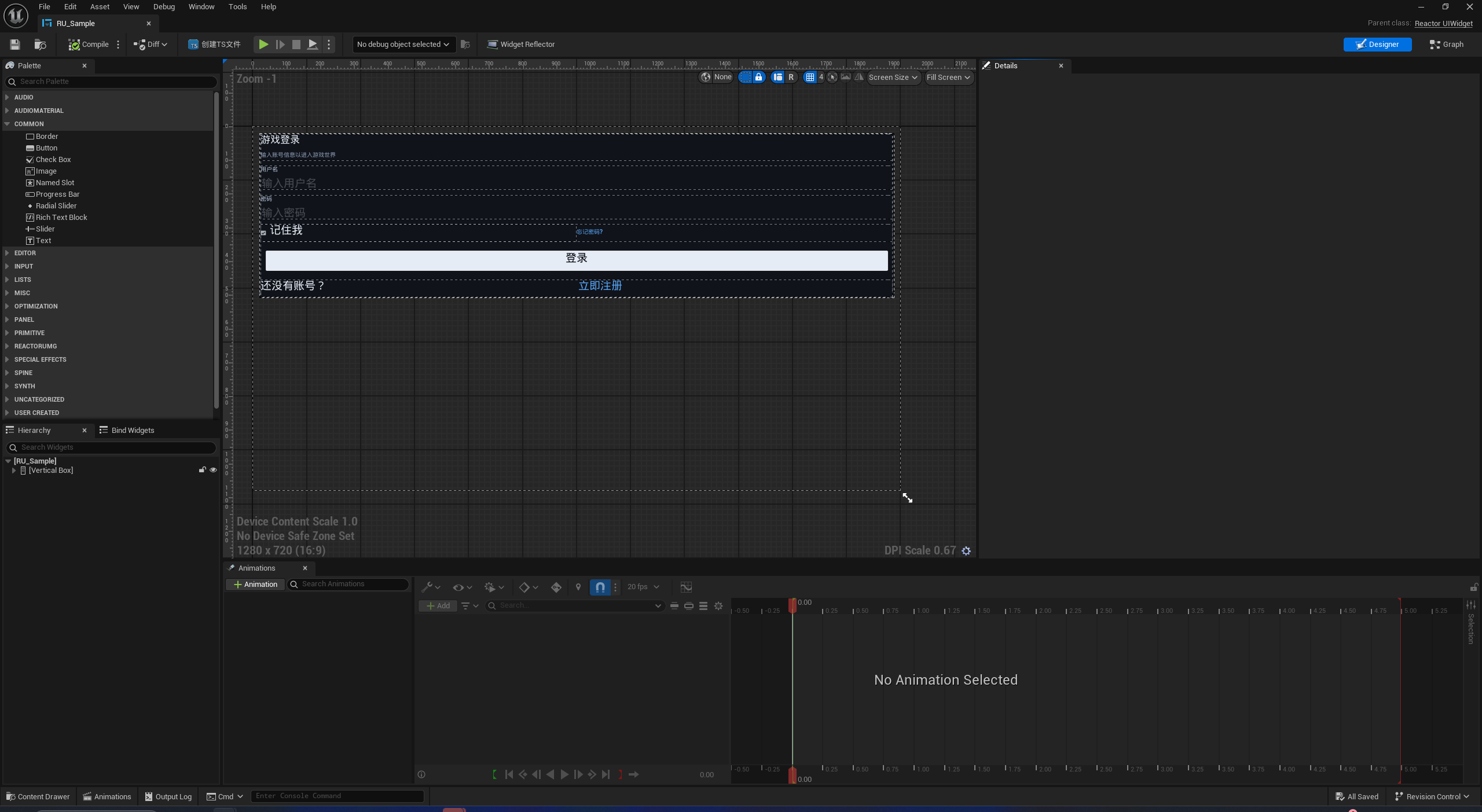 首先右键点击内容浏览器,选中ReactorUMG->ReactorUMG类型资产,并且重命名为RU_Sample,打开UI编辑器,使用AI Coding实现一个登录界面。