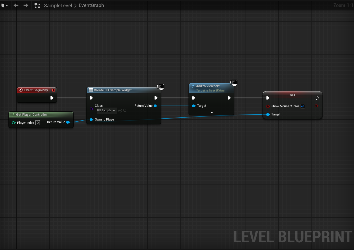 实例中我们在关卡蓝图中创建游戏UI Widget(用法与UserWidget一致,使用内置的CreateWidget蓝图库函数)并且添加到视口。