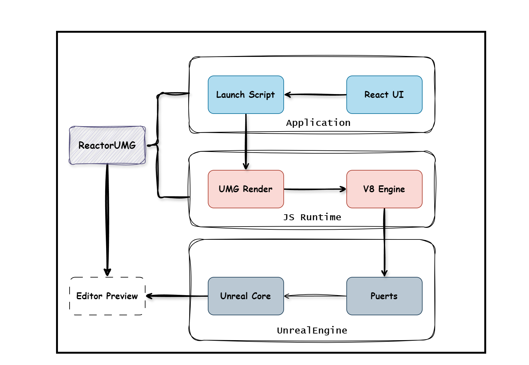 - 如图所示,系统从上到下分为三层:应用层(Application)、JS运行层(JS Runtime)、UE层(UnrealEngine)。