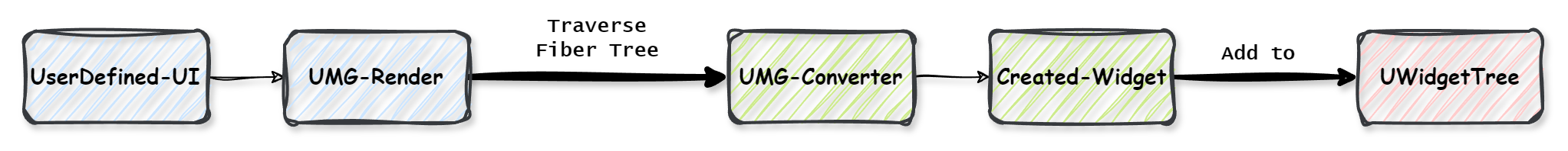 执行过程可以简化为从用户自定义UIUserDefined-UI出发,在UMG-Render中遍历react firber树,并且通过UMG-Converter将react节点转换成UMG组件Created-Widget,最后将UMG组件按照firber树的遍历顺序重建出用于UMG Widget渲染的WidgetTree,过程如下图所示。